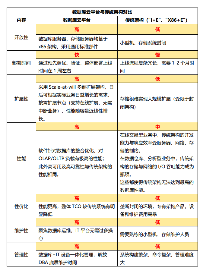 对他们而言,在采用数据库云平台之前,传统“IOE”架构产品基本完全占据了核心数据库系统领域的市场。但由于其业务体量庞大,业务飞速发展的同时,传统架构的弊端也逐渐凸显。我们可以从如下的对比发现,数据库云平台在各方面均优势明显,对比分析图如下: