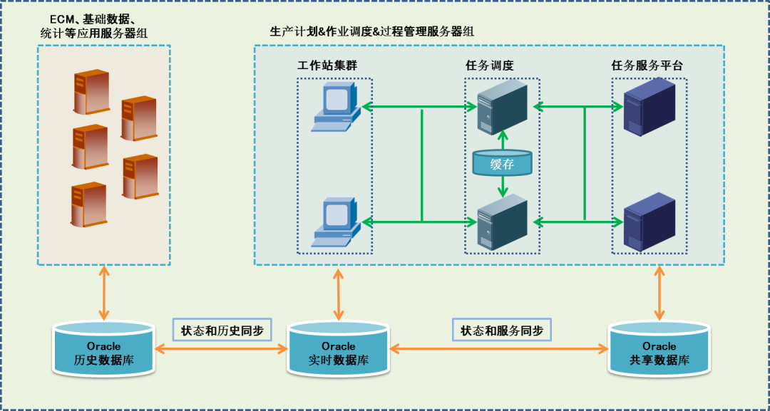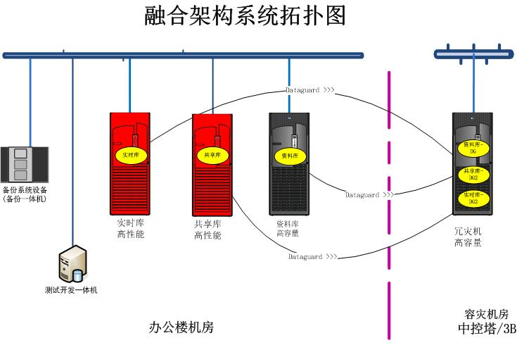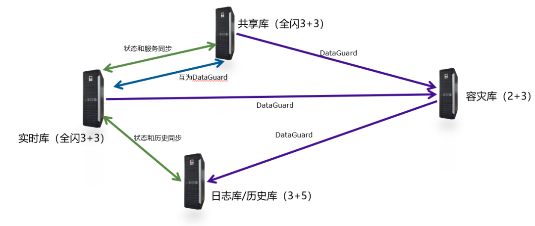 两套缓存性高容量PBData一体机,一台作为历史数据库与实时数据库之间进行状态和历史同步,另一台作为实时数据、共享数据库和历史库的容灾数据库,通过Oracle DataGuard进行数据同步,容灾库为两个计算节点,每个节点服务一个数据库的容灾。