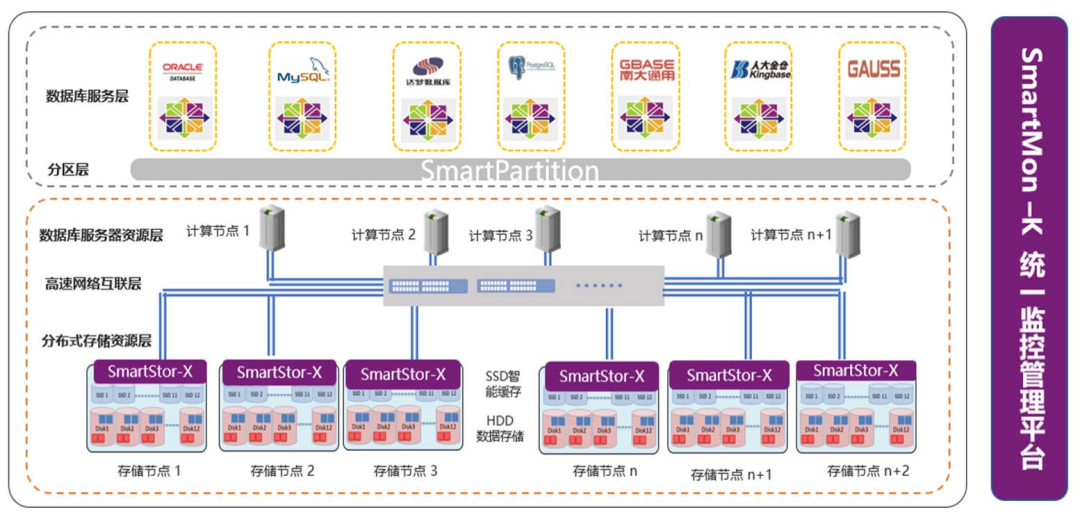 硬件X86化:计算节点,存储节点所有硬件采用标准X86设备,彻底实现去小型机、去高端存储。