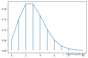import numpy as npfrom scipy import statsimport matplotlib.pyplot as pltlam=3 #λ为单位时间内事件的平均发生次数k=10 #k为事件发生次数x=np.arange(0,k+1,1)plist=stats.poisson.pmf(x,lam) #返回列表,1、2、3……次的概率print(plist)plt.plot(x,plist)plt.vlines(x,0,plist)plt.show()