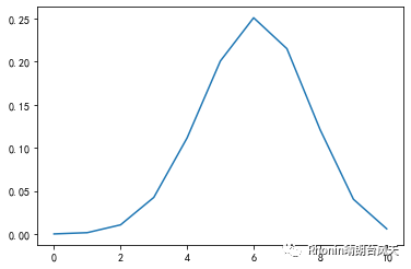 import numpy as npfrom scipy import statsimport matplotlib.pyplot as pltp=0.6 #假设事件A概率0.6n=10 #次数x=np.arange(0,n+1,1)plist=stats.binom.pmf(x,n,p) #返回列表,对应概率plt.plot(x,plist)plt.show()
