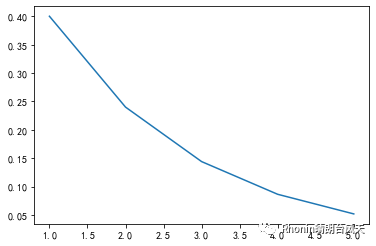 import numpy as npfrom scipy import statsimport matplotlib.pyplot as pltk=5 #5次就成功的概率p=0.4 #成功概率x=np.arange(1,k+1,1)plist=stats.geom.pmf(x,p)print(plist)plt.plot(x,plist)plt.show()