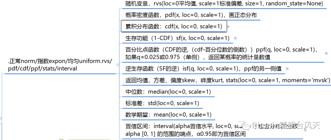 我们着重放在stats统计这个子库标黄部分上,它包含大量概率分布、汇总和频率统计、相关函数和统计检验、屏蔽统计、核密度估计、准蒙特卡罗功能等。