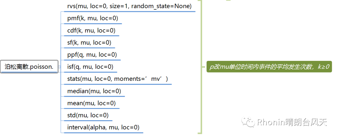 泊松离散随机变量:scipy.stats.poisson.pmf(k, mu, loc=0)