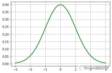 import mathimport numpy as npimport matplotlib.pyplot as pltu = 0 # 均值μsig = math.sqrt(1) # 标准差δx = np.linspace(u - 3*sig, u + 3*sig, 50) # 定义域y = np.exp(-(x - u) ** 2 (2 * sig ** 2)) (math.sqrt(2*math.pi)*sig) # 定义曲线函数plt.plot(x, y, "g", linewidth=2) # 加载曲线plt.grid(True) # 网格线plt.show() # 显示