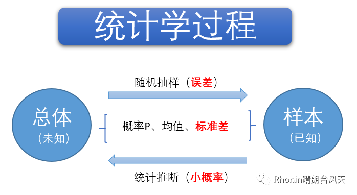 简单画了个图说明统计学过程,误差贯穿整个统计学,它决定了样本的质量、数据的波动情况,甚至研究如何减小或控制误差从而正确推断总体。还记得咱们前面写的那句话:当样本足够小,一切皆有可能。形容误差真的再贴切不过了。