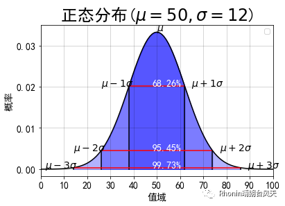 由下图正态分布可以知道,标准差可以用来衡量置信度,在一个标准差之内,我们对平均值的置信度为68.26%,2个标准差置信度95.45%(常用),3个标准差的置信度是99.73%。这就是传说中正态分布的"68-95-99.7法则"