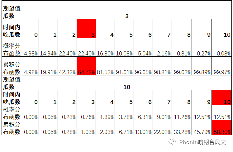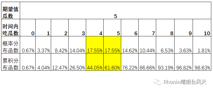 举个例子,在某个时间段内吃瓜的数学期望次数应该是5,那这个时间内吃6次及7次以上概率是1-61.6%=38.4%.大家特别留意一下标黄部分,当超过期望值后概率分布函数就开始降低了
