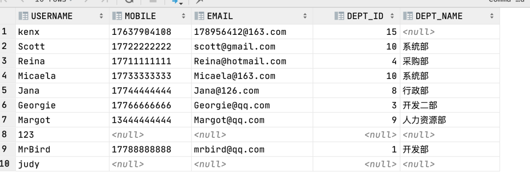 如下图我们可以看到,左外连接 t_user 表里面 USERNAME 为 kenx 的记录,其 DEPT_ID 为 15,但 DEPT_ID 为 15 的记录在 t_dept 表里面是不存在的,此时,我们用的是左外连接,因此,可以查出该条记录,但 t_dept 表里面的字段的值都是 NULL。