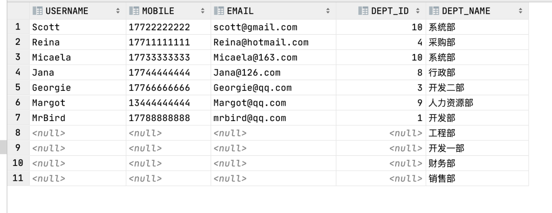 刚好相反 查询出了所有部门信息,不符合条件的用户信息字段都为NULL