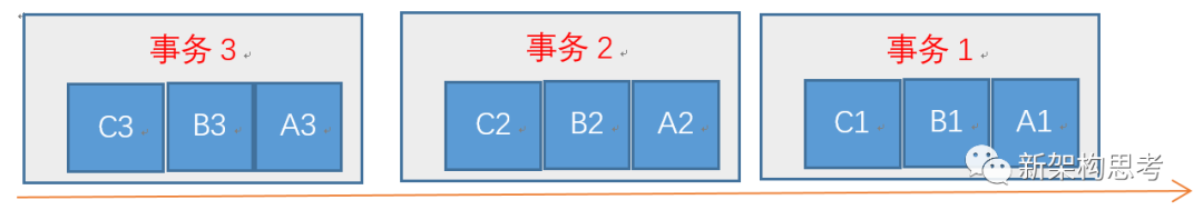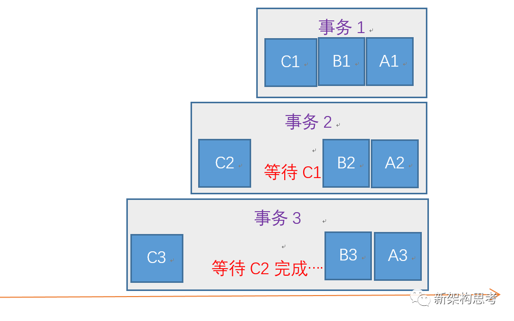 如下图所示,我们假设一个虚拟抢票系统,用户“购票”事务包括三个步骤:创建订单(A)、扣减账户余额(B)、扣减总库存(C)。当三个用户同时“购票”时,总的执行顺序是:用户 1 创建订单 → 用户 1 扣减账户余额 → 扣减总库存 → 用户 2 创建订单 → 用户 2 扣减账户余额 → 扣减总库存 → 用户 3 创建订单 → 用户 3 扣减账户余额 → 扣减总库存。