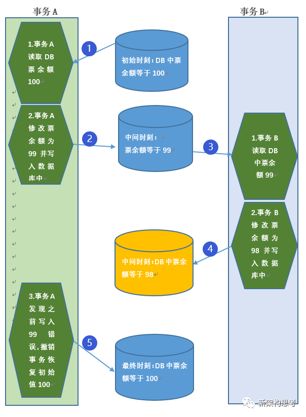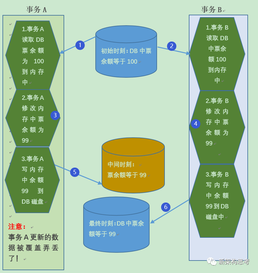 (6)事务 B 同样将修改后的数值 99 写入到数据库物理磁盘中。这个时候,错误就发生了,两个事务 A、B 都进行了扣减票数的操作,但是最终数据库中的数值却只扣减了一次。