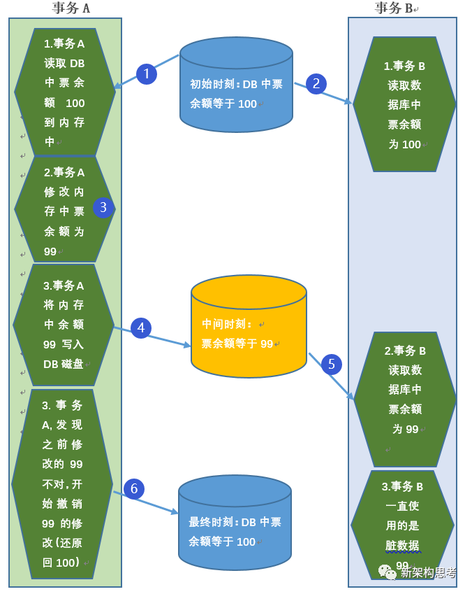 (5)事务 B 此时正好又重新读取数据库中的余票数,这次读取发现值是 99,事务 B 以为 99 是最新的修改后正确的值。