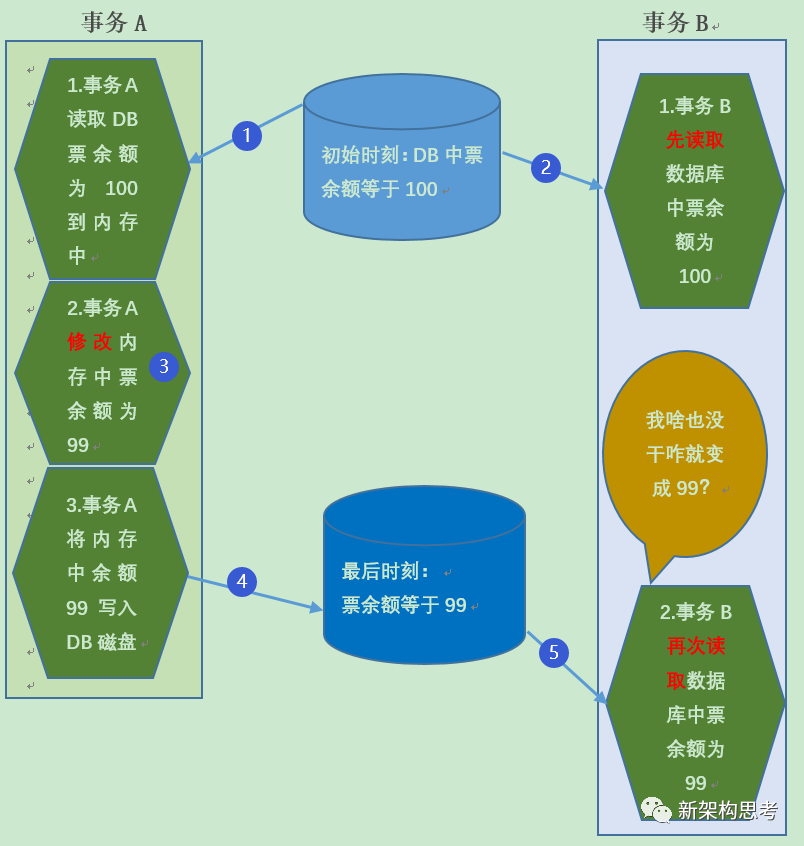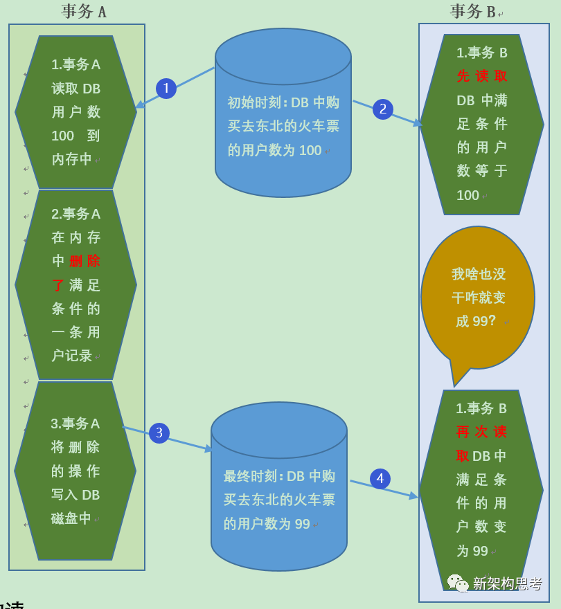 事务 B 第一次读取余票数结果为 100,中间这段时间内,事务 B 没有做任何操作,而再次读取余票数的时候,发现已经变为了 99,事务两次读取的结果不一致,产生了不能重复读异常。