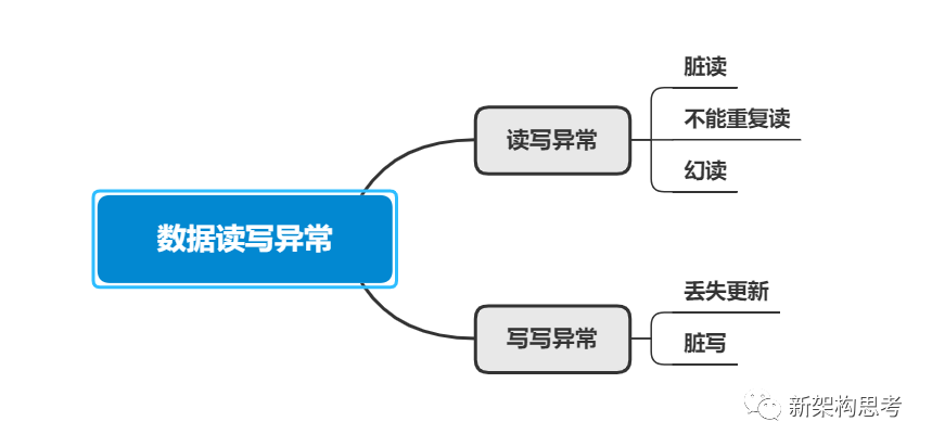 事务间的读读操作肯定不会产生异常,异常要么发生在读写之间,要么发生在写写之间。上面分析的五种数据读写异常可以分成两类:一类是读写相关的异常,一类是写写相关的异常。