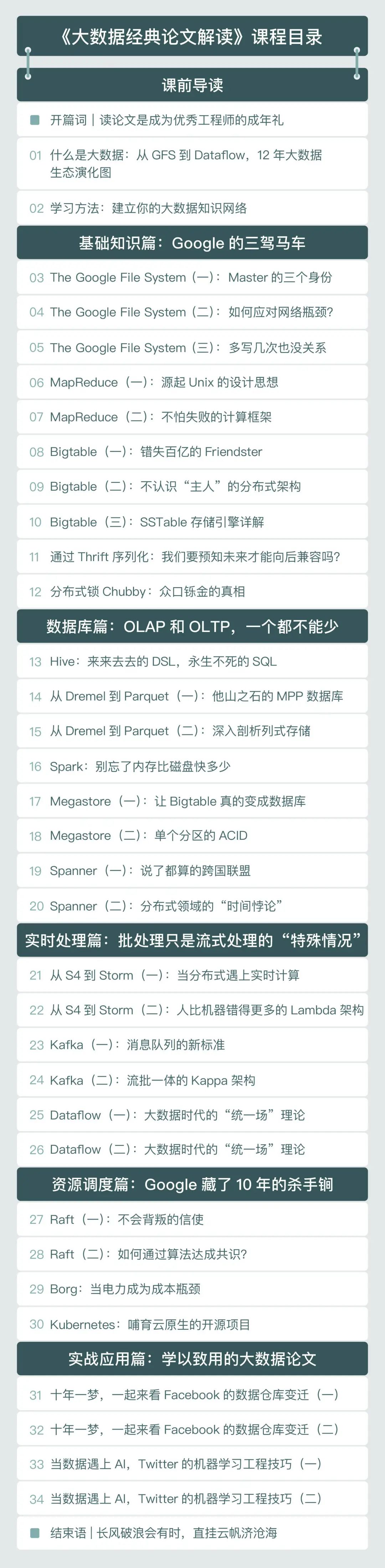 开头我就说过,我们面对的是异常复杂的大数据生态系统。而徐文浩帮大家简化过了大数据论文脉络关系,让你在对某一篇论文感到困惑的时候,可以通过脉络图翻看它前后对应的论文,找到对应问题的来龙去脉,让你大家在研读大数据论文的时候,有一个清晰的方向。