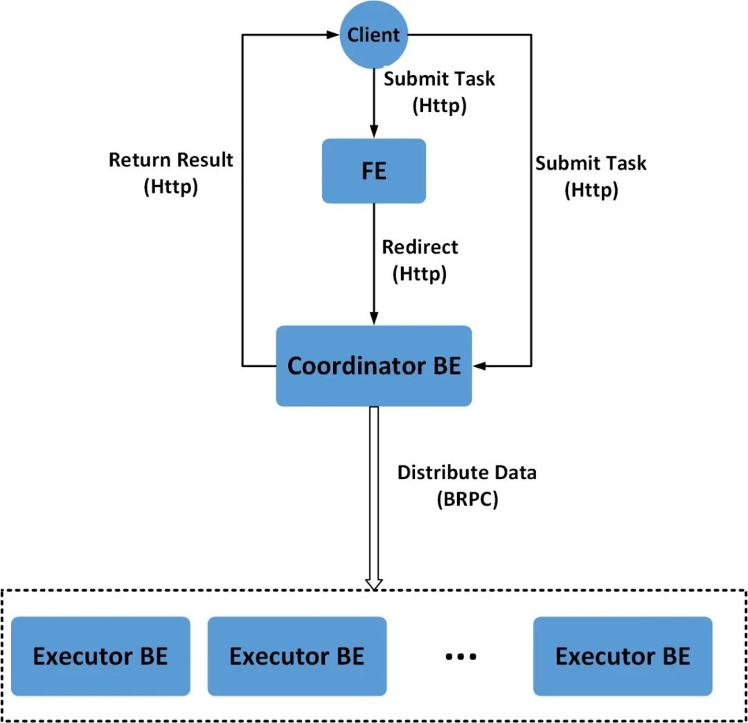用户将Stream Load的Http请求提交给FE,FE会通过 Http 重定向(Redirect)将数据导入请求转发给某一个BE节点,该BE节点将作为本次Stream Load任务的Coordinator。在这个过程中,接收请求的FE节点仅仅提供转发服务,由作为 Coordinator的BE节点实际负责整个导入作业,比如负责向Master FE发送事务请求、从FE获取导入执行计划、接收实时数据、分发数据到其他Executor BE节点以及数据导入结束后返回结果给用户。用户也可以将Stream Load的Http请求直接提交给某一个指定的BE节点,并由该节点作为本次Stream Load任务的Coordinator。在Stream Load过程中,Executor BE节点负责将数据写入存储层。