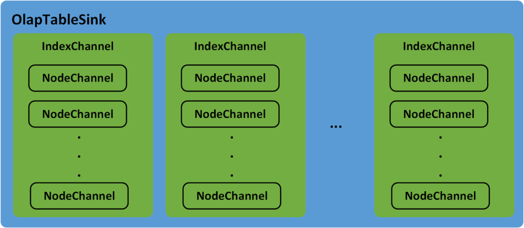 OlapTableSink负责Stream Load任务的数据分发。Doris中的Table可能会有Rollup或物化视图,每一个Table及其Rollup、物化视图都称为一个Index。数据分发过程中,IndexChannel会维护一个Index的数据分发通道,Index下的Tablet可能会有多个副本(Replica),并分布在不同的BE节点上,NodeChannel会在IndexChannel下维护一个Executor BE节点的数据分发通道,因此,OlapTableSink下包含多个IndexChannel,每一个IndexChannel下包含多个NodeChannel,如图5所示。