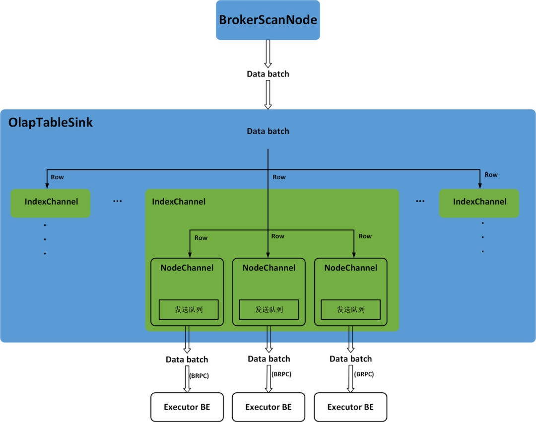 OlapTableSink分发数据时,会逐行读取BrokerScanNode获取到的数据Batch,并将数据行添加到每一个Index的IndexChannel中。可以根据 PartitionKey和DistributionKey确定数据行所在的Partition和Tablet,进而根据Tablet在Partition中的顺序计算出数据行在其他Index中对应的Tablet。每一个Tablet可能会有多个副本,并分布在不同的BE节点上,因此,在IndexChannel中会将每一个数据行添加到其所在Tablet的每一个副本对应的NodeChannel中。每一个NodeChannel中都会有一个发送队列,当NodeChannel中新增的数据行累积到一定的大小就会作为一个数据Batch被添加到发送队列中。OlapTableSink中会有一个固定的线程依次轮训每一个IndexChannel下的每一个NodeChannel,并调用BRPC将发送队列中的一个数据Batch发送到对应的Executor BE上。Stream Load任务的数据分发过程如图6所示。