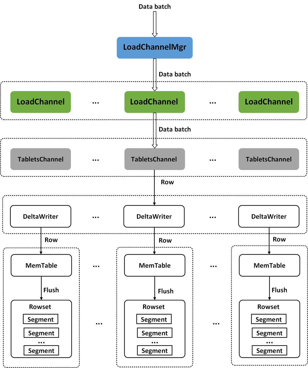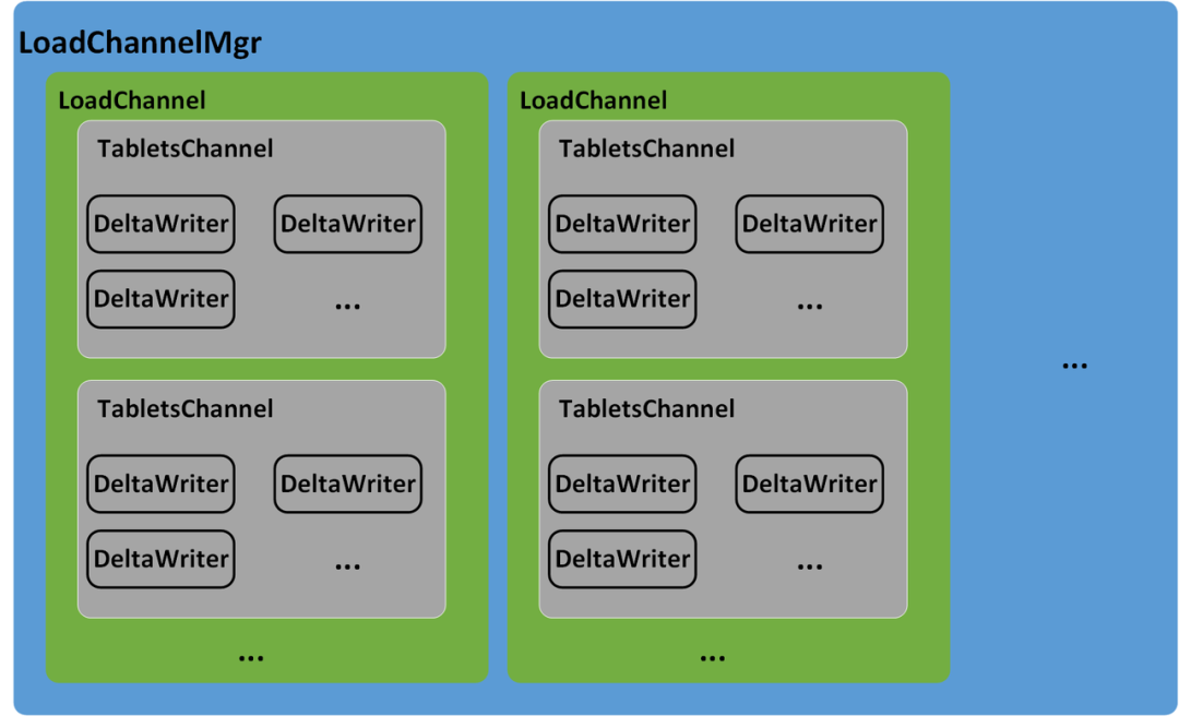 Executor BE的BRPC server接收到Coordinator BE发送来的数据Batch之后,会将数据写入任务提交到线程池来异步执行。在Doris的BE中,数据采用分层的方式写入存储层,每一个Stream Load任务在每个Executor BE上都对应一个LoadChannel,LoadChannel维护一次Stream Load任务的数据写入通道,负责一次Stream Load任务在当前Executor BE节点的数据写入,LoadChannel可以将一次Stream Load任务在当前BE节点的数据分批写入存储层,直到Stream Load任务完成。每一个LoadChannel由Load Id唯一标识,BE节点上的所有LoadChannel由LoadChannelMgr进行管理。一次Stream Load任务对应的Table可能会有多个Index,每一个Index对应一个TabletsChannel,由Index Id唯一标识,因此,每一个LoadChannel下会有多个TabletsChannel。TabletsChannel维护一个Index的数据写入通道,负责管理Index下所有Tablet的数据写入,TabletsChannel会逐行读取数据Batch并通过DeltaWriter写入对应的Tablet中。DeltaWriter维护一个Tablet的数据写入通道,由Tablet Id唯一标识,负责接收单个Tablet的数据导入,并将数据写入Tablet对应的MemTable中,当MemTable写满之后,会将MemTable里的数据刷写(Flush)到磁盘并生成一个个Segment文件。MemTable采用SkipList的数据结构,将数据暂时保存在内存中,SkipList会按照Schema的Key对数据行进行排序,另外,如果数据模型为Aggregate或Unique,MemTable会对具有相同Key的数据行进行聚合。Stream Load任务的数据写入通道如图7所示。