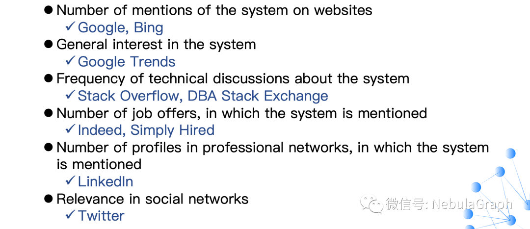插个题外话,这里说下 DB-Engine 的排名规则,它的排序依据是 Google、Bing 搜索引擎的搜索结果,Google Trends 里的关键词趋势,像 Stack Overflow、DBA Stack Exchange 上的讨论,Indeed 之类的招聘网站的招聘数,Linkedin 里的职位数以及社交网络主要是 Twitter 的讨论量。