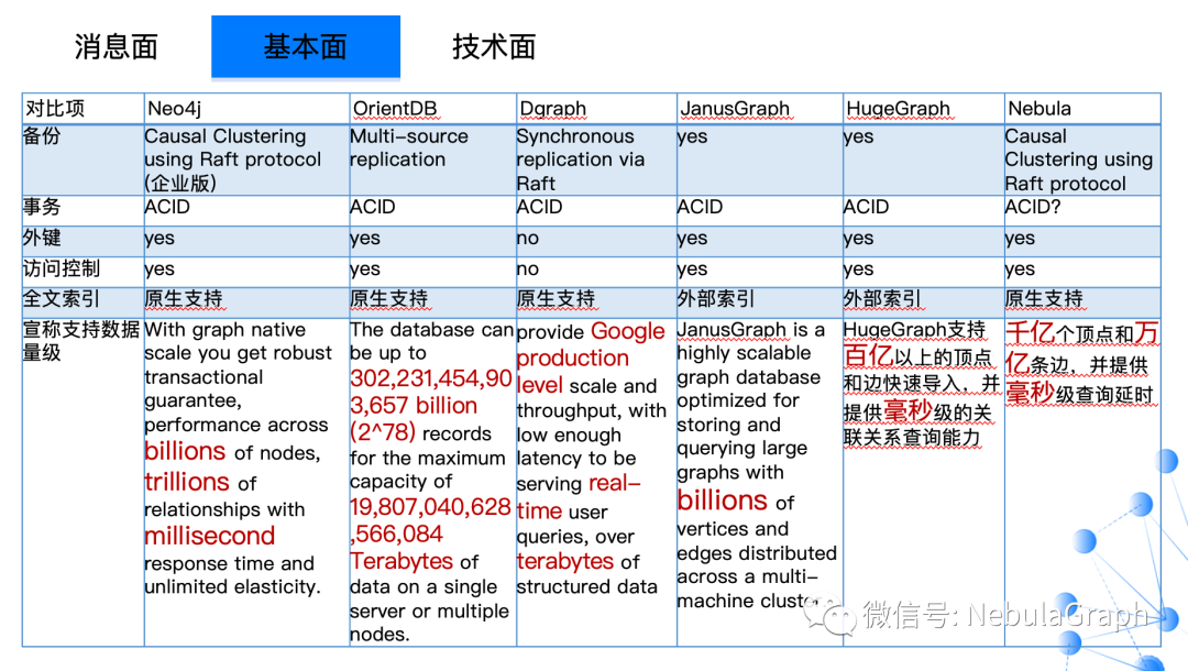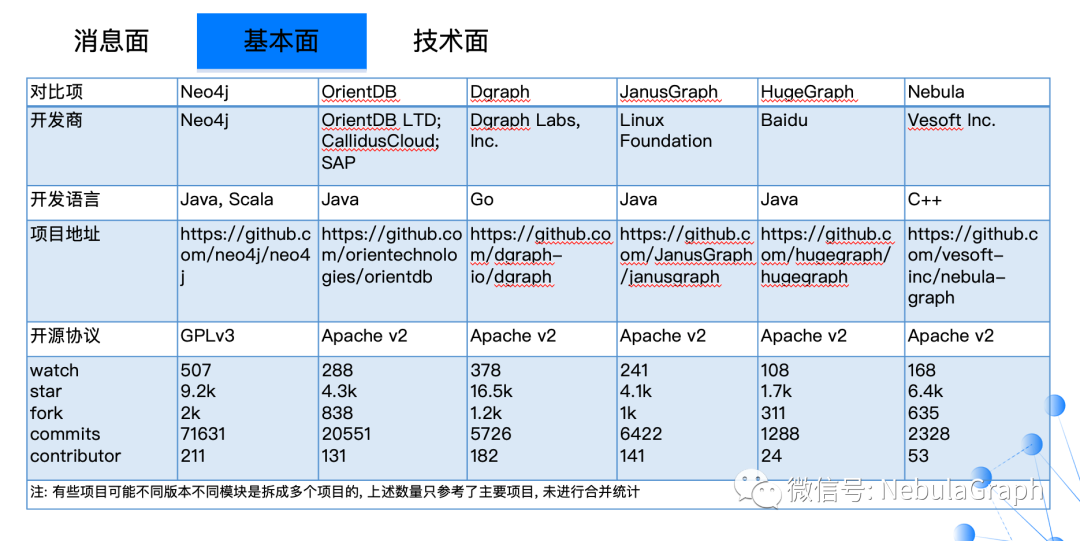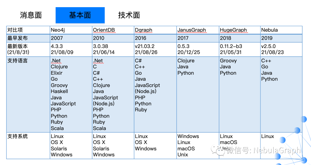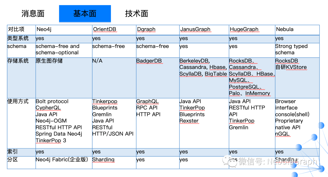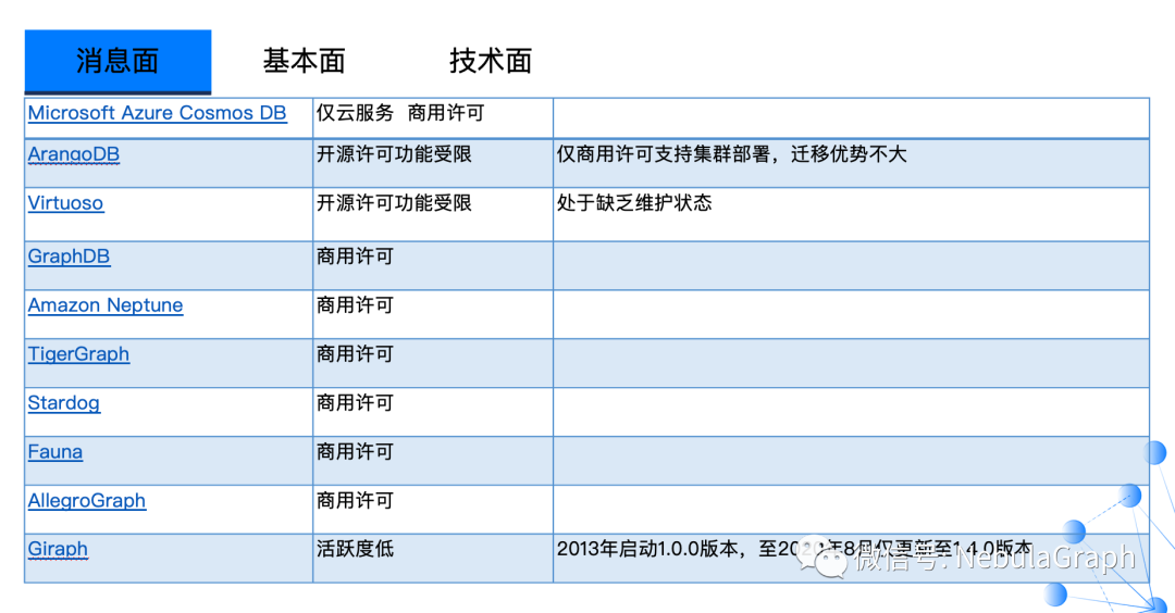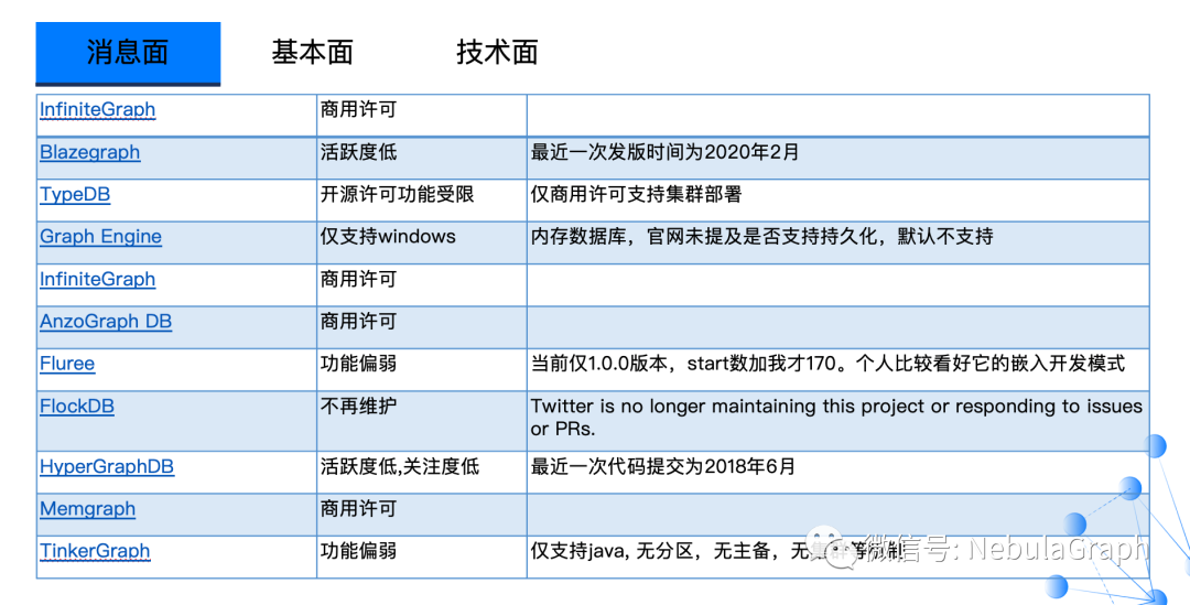 选图数据库和选股票类似,我们会考虑一些消息面、基本面和技术面,当然二者之间还是有区别的。图数据库的三面主要是下面几点: