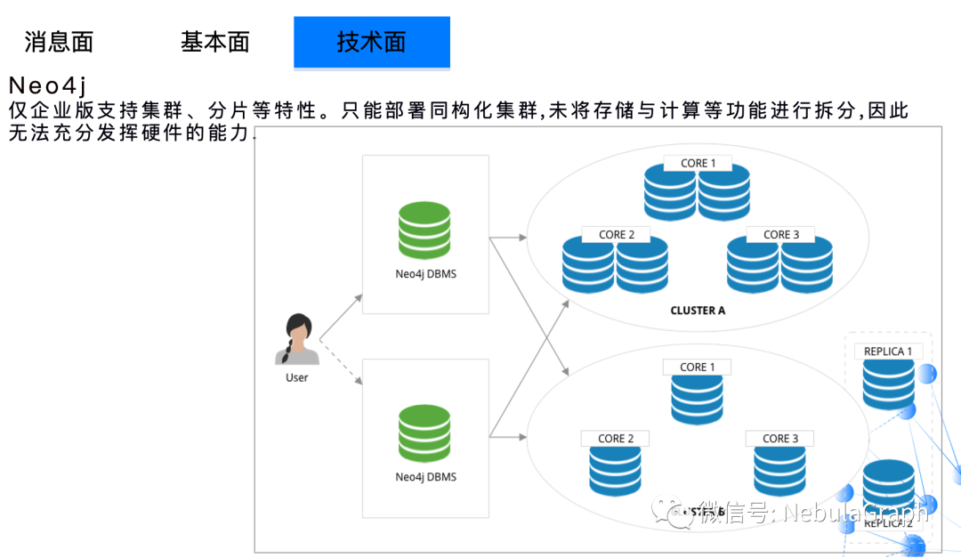 Neo4j 只支持同构部署,不支持异构部署,所以不能发挥每台机器的特异性,比如:有的机器它可能是计算型的,有的机器 IO 强,如果按照 Neo4j 的部署设定,这就要求每台机器情况等同。Neo4j 的分析能力和性能提升,主要依靠两个 Fabric 组成的虚拟机提供区域分区能力(上图绿色部分)。