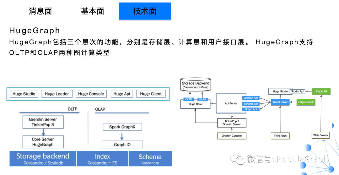 在计算这块,主要基于底部的存储引擎提供了 OLTP 和 OLAP 能力。这里 HugeGraph 的存储引擎不是用自己的存储引擎,主要还是依赖于其他的存储引擎,这里可能不如 Nebula 用自己的存储引擎。举个例子,我们用的第三方存储引擎是 HBase,HBase 的实时性是非常差的,这时候用它做存储引擎就会影响到上一层的性能。