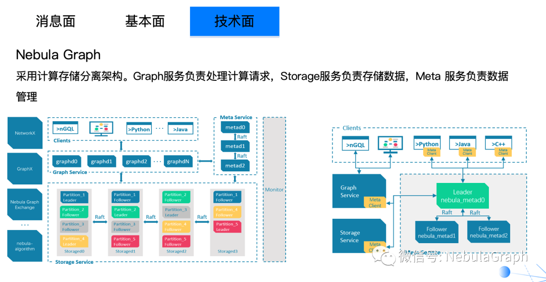 Nebula Graph 这里也是一个存储和计算分离的一个架构,每一层都可无限扩展,你的存储不够就加存储,计算不够就加计算,相对而言还是一个比较先进的架构。