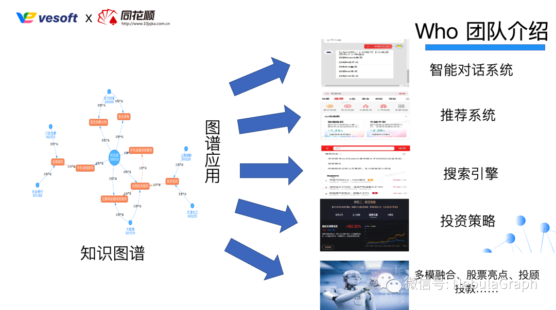 最后来介绍下我们的团队——同花顺知识图谱团队,主要面向的业务是:智能对话、推荐系统、搜索引擎、投资策略以及多模融合、股票亮点、投顾投教这样的一些业务,后面可能接入更多的业务场景。