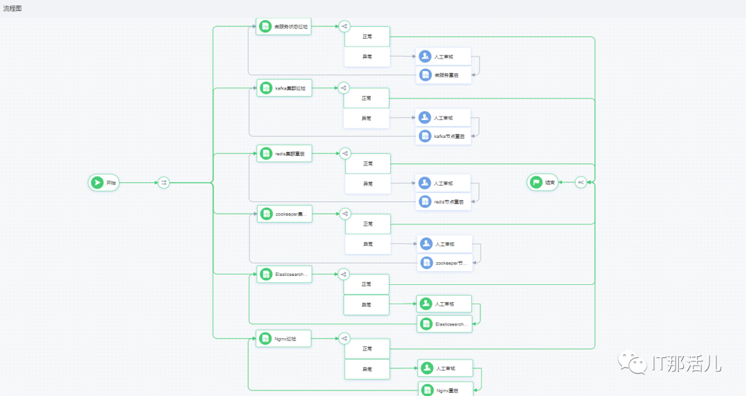 从该流程图上可以很明确清晰的看到在巡检过程中Elasticsearch、nginx两个组件进程异常,并通过了人工审核的步骤,再执行重启,重启完毕之后再次执行集群巡检,指导正常才通过。日常巡检自动化后: