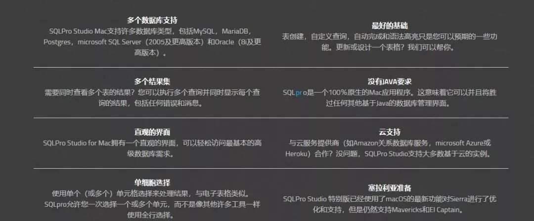 SQLPro Studio 是一款Mac上优秀的数据库客户端,支持Postgres, MySQL,Microsoft SQL Server,Oracle等主流数据库,可以方便易用的管理数据库。