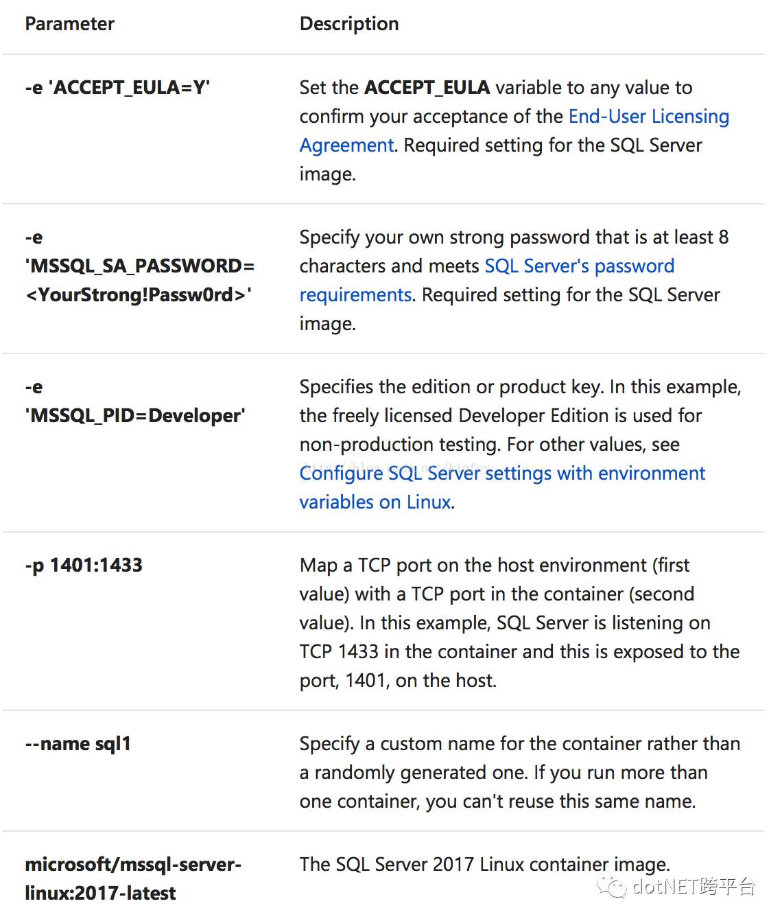 docker run -e 'ACCEPT_EULA=Y' -e 'MSSQL_SA_PASSWORD=你的sa密码' -e 'MSSQL_PID=Developer' -p 1401:1433 --name sql1 -d microsoft/mssql-server-linux:2017-latest