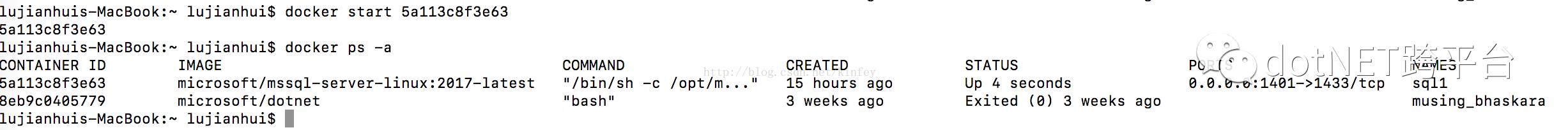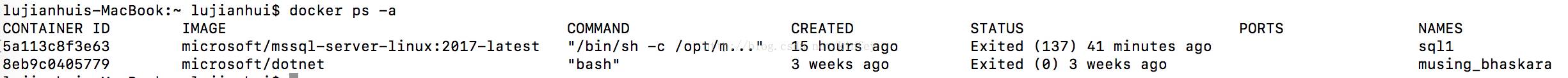 如上图,SQL Server的容器是退出状态,你可以通过docker start 你的容器id启动