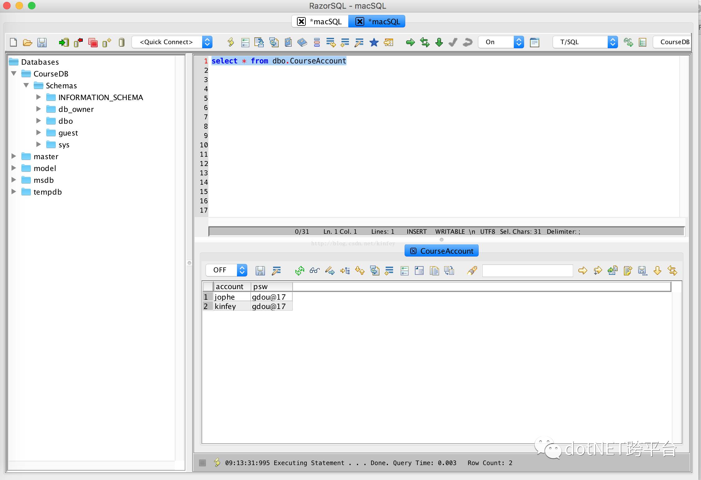 3. 管理,在Windows上你有一个很好的SQL Server管理工具,在Linux/macOS上呢?其实都可以有,如商业化的RazorSQL就很不错了,我尝试连上去,还可以