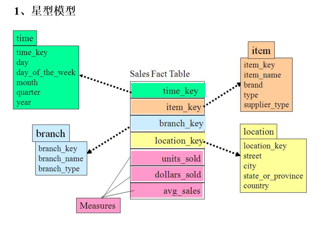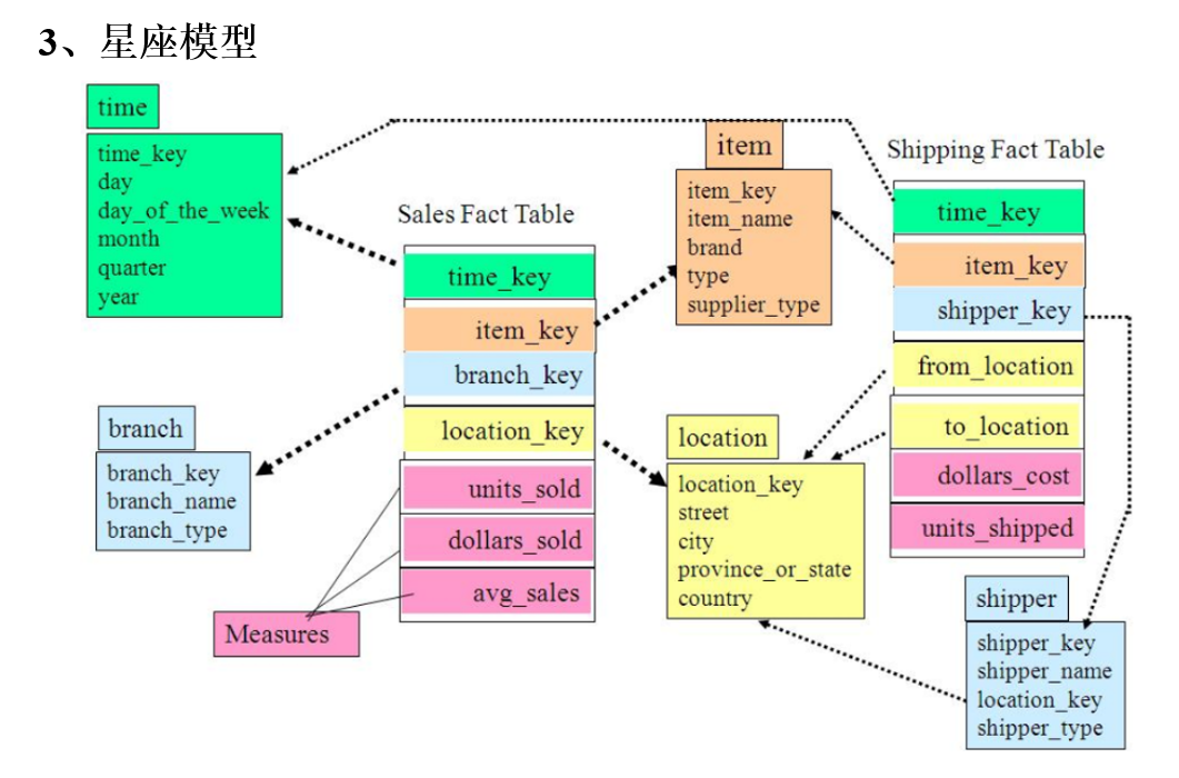 星座模型:由多个事实表组合,维表是公共的,可以被多个事实表共享。