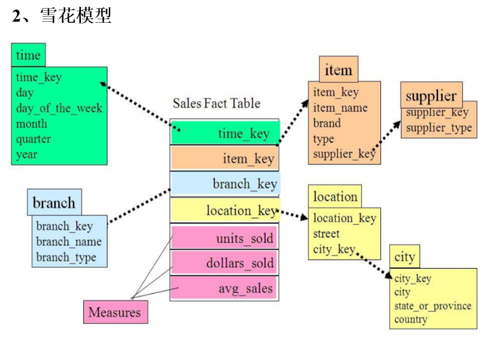 雪花型模型:当有一个或多个维表没有直接连接到事实表上,而是通过其他维表连接到事实表上时,其图解就像多个雪花连接在一起,故称雪花模型。雪花模型是对星型模型的扩展。它对星型模型的维表进一步层次化,原有的各维表可能被扩展为小的事实表,形成一些局部的 "层次 " 区域,这些被分解的表都连接到主维度表而不是事实表。