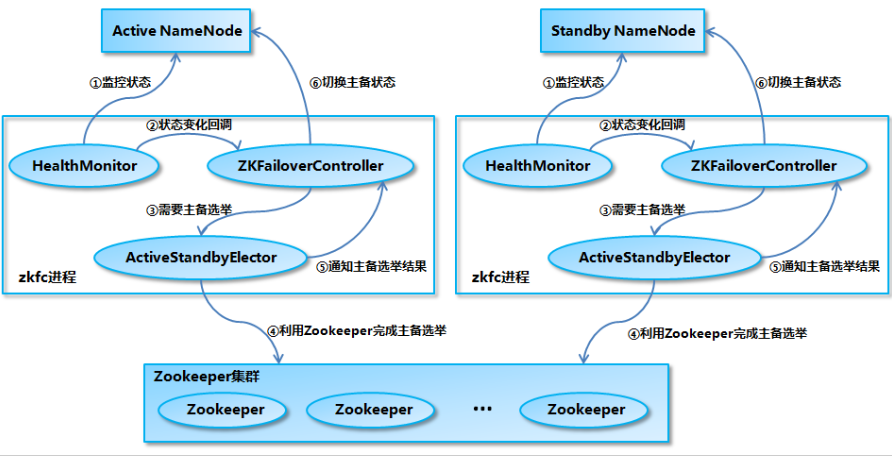 主备切换控制器 ZKFailoverController:ZKFC 作为独立的进程运行,对 NameNode 的主备切换进行总体控制。ZKFailoverController 能及时检测到 NameNode 的健康状况,在主 NameNode 故障时借助 Zookeeper 实现自动的主备选举和切换,当然 NameNode 目前也支持不依赖于 Zookeeper 的手动主备切换。