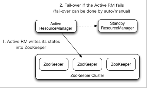 RM会把job的信息存放在zookeeper的/rmstore目录下,active RM会向这个目录写app的信息。当active RM挂掉之后,standby RM会通过zkfc切换为active状态,然后从zookeeper的/rmstore目录下读取相应的作业信息。重新构建作业的内存信息,启动内部服务,开始接受NM的心跳信息,构建集群的资源信息,并且接受客户端的作业提交请求。