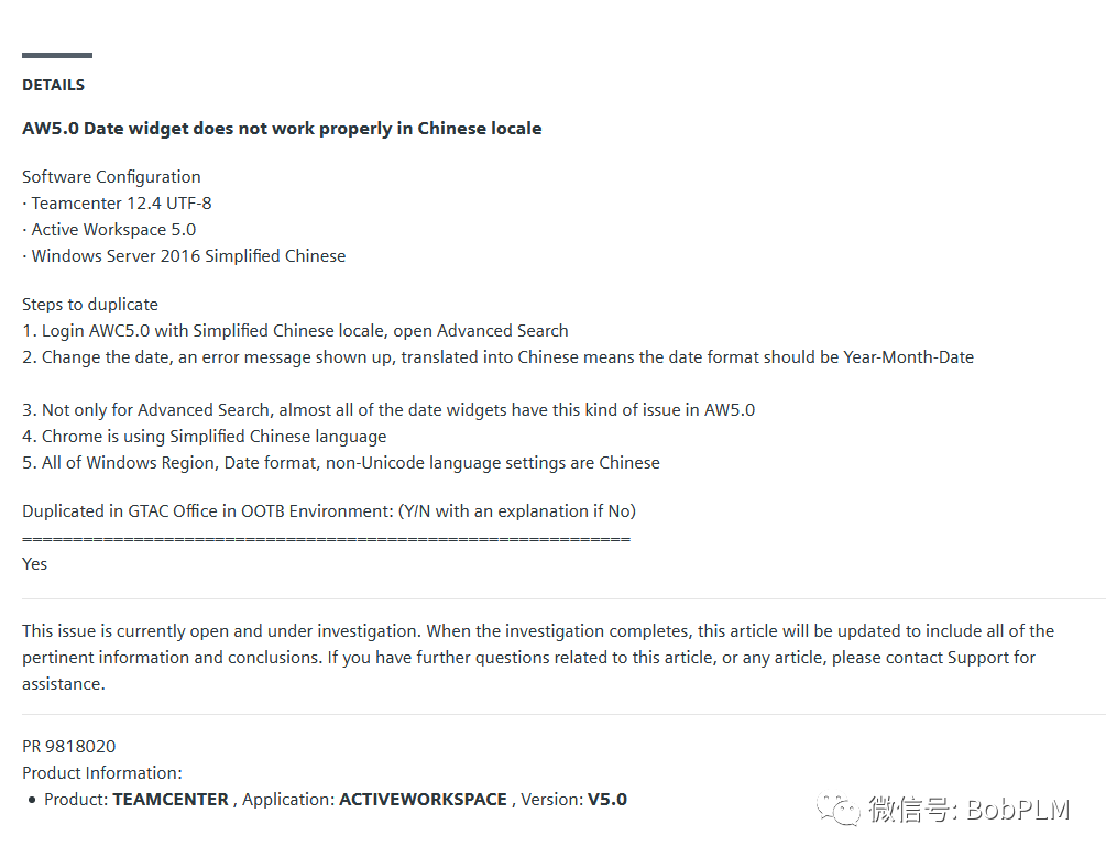 该问题已经在GTAC上报了PR了,PR号为 9818020(https://support.sw.siemens.com/en-US/product/282219420/knowledge-base/PL8511488?pid=sc%3Asearch&pid_context=awc%20date%20valid%20error%20chinese&index=content-external&audience=external)