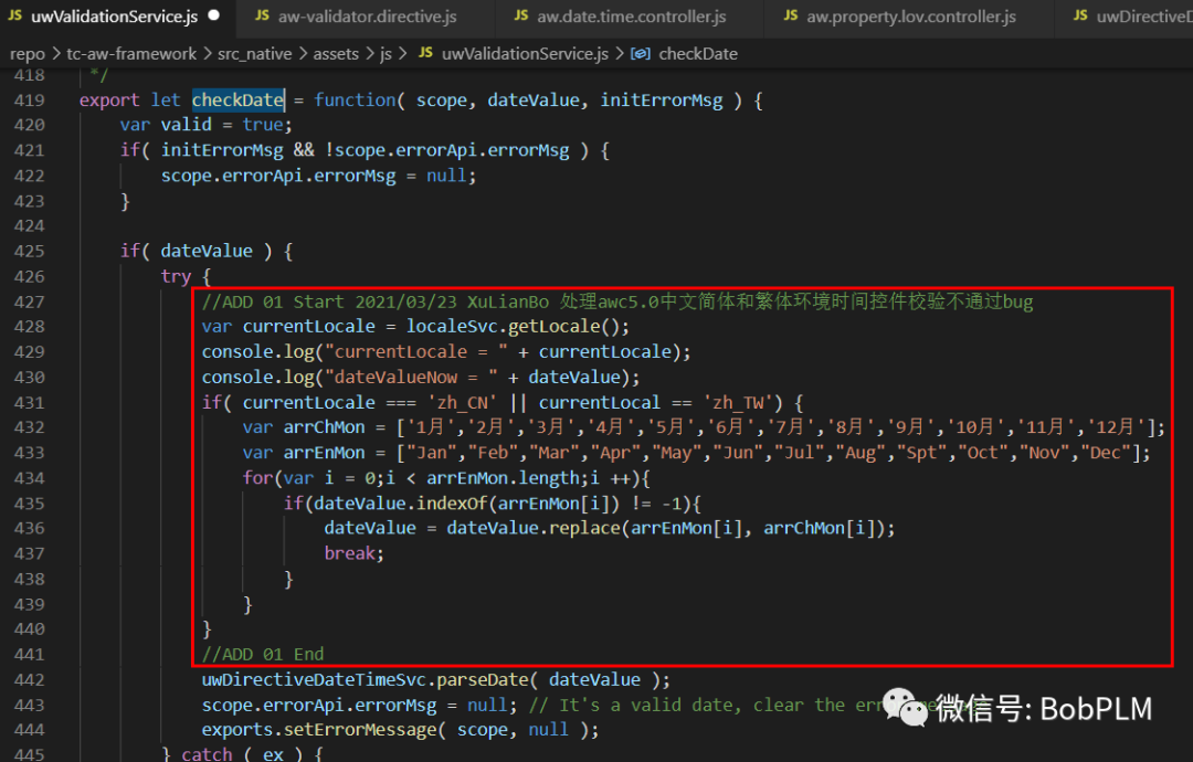 在检验格式的方法里,加入以下补充逻辑,将中文环境时候将英文的日期格式转换为中文日期格式,从而通过时间格式校验(这种是补丁的方式,对原有ootb功能改动最小),代码如下: