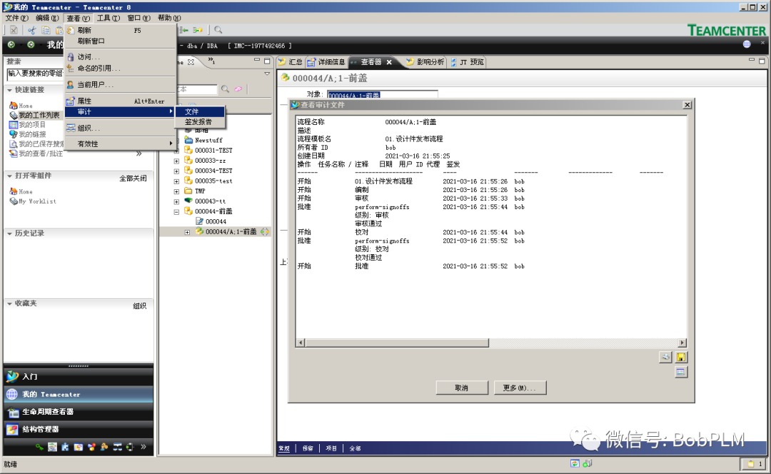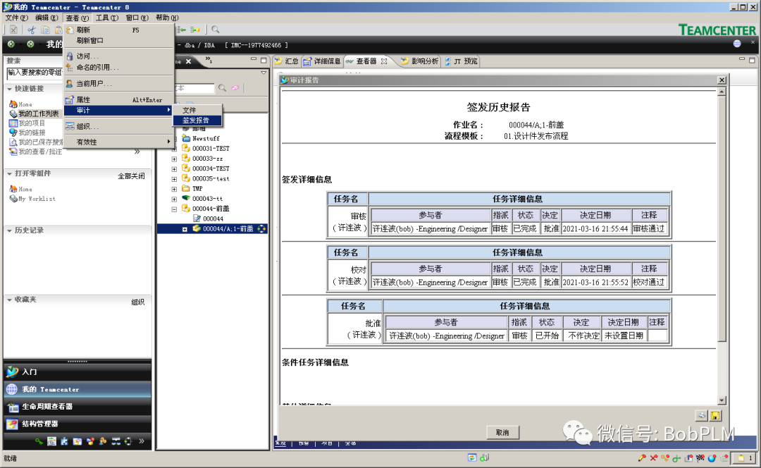 实施过Teamcenter10.1以前老版本项目的应该深有体会,在流程签审记录查看这块很不方便,比如Teamcenter8.3\Teamcenter9.1版本中想要查看流程签审记录得执行菜单“查看”->“审计”->"文件"/“签发报告”,才能看到基于文本的签审记录,无从进一步签审记录排序筛选等,因此这块很多项目是结合二开来做一个查看签审记录界面的,从Teamcenter10.1版本开始才有了专门查看签审记录的“流程历史记录”视图