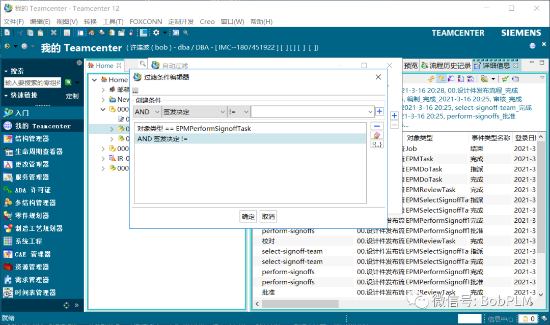 在详细信息视图中有个“过滤管理器”可以对显示的信息进行过滤,是否可以将该功能添加到“流程历史记录”视图中,来对显示的内容进行过滤?比如过滤“对象类型”为EPMPerformSignoffTask,并且签发决定不等于空的,则就能过滤出批准或者拒绝的签审记录