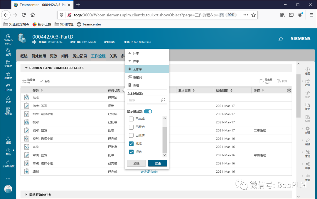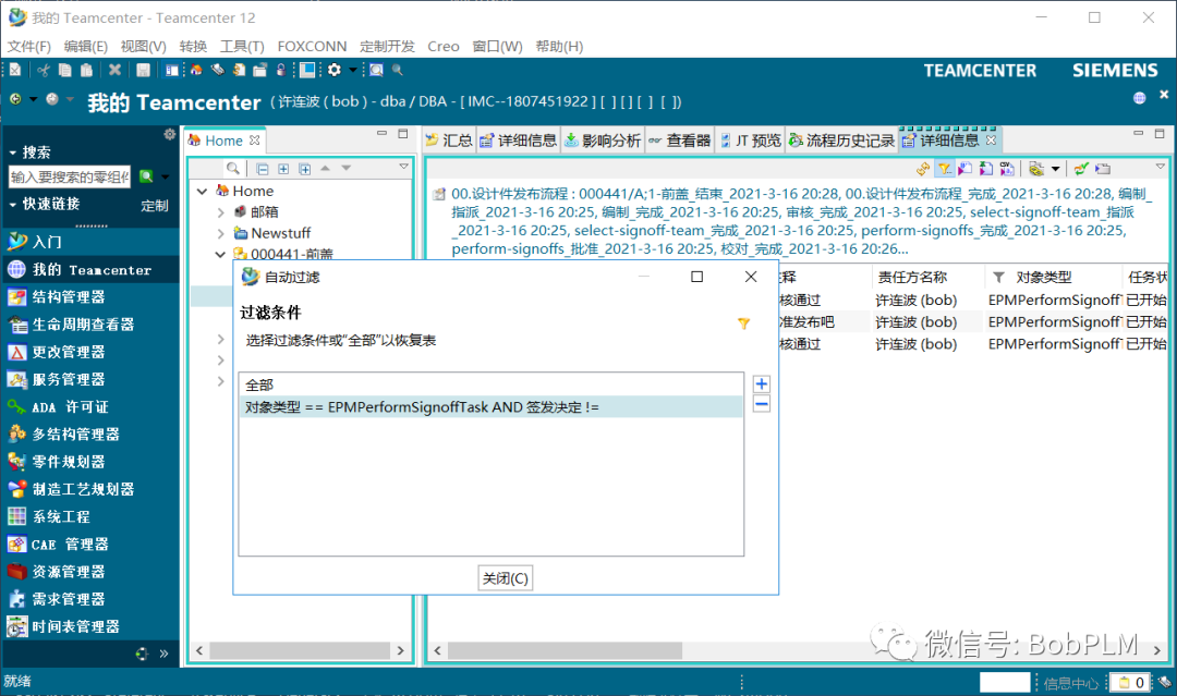 想对签审记录进行过滤,在Teamcenter10.1版本以后(包括本版本),胖客户端中可以将所有的签审信息显示在“详细信息”视图中,再进一步进行过滤,在awc中可以直接过滤。