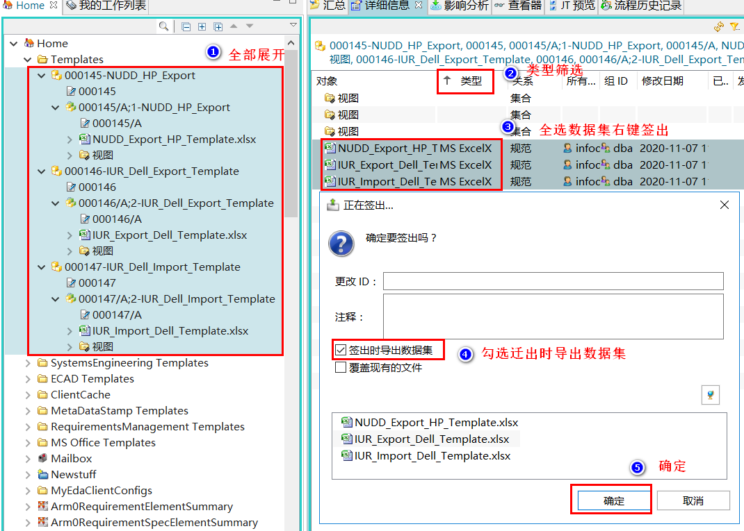 系统配置或者系统使用时,经常会遇到要对大量数据集内容进行替换\修改\备份情况,如果一个个数据集去处理效率比较低,可以通过批量选择数据集后,签出确认对话框勾选“签出时导出数据集”,