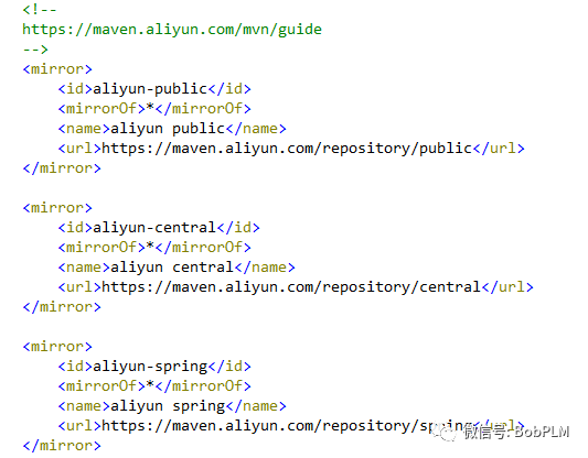 <mirrors><!--https://maven.aliyun.com/mvn/guide--><mirror><id>aliyun-public</id><mirrorOf>*</mirrorOf><name>aliyun public</name><url>https://maven.aliyun.com/repository/public</url></mirror><mirror><id>aliyun-central</id><mirrorOf>*</mirrorOf><name>aliyun central</name><url>https://maven.aliyun.com/repository/central</url></mirror><mirror><id>aliyun-spring</id><mirrorOf>*</mirrorOf><name>aliyun spring</name><url>https://maven.aliyun.com/repository/spring</url></mirror><mirror><id>aliyun-spring-plugin</id><mirrorOf>*</mirrorOf><name>aliyun spring-plugin</name><url>https://maven.aliyun.com/repository/spring-plugin</url></mirror><mirror><id>aliyun-apache-snapshots</id><mirrorOf>*</mirrorOf><name>aliyun apache-snapshots</name><url>https://maven.aliyun.com/repository/apache-snapshots</url></mirror><mirror><id>aliyun-google</id><mirrorOf>*</mirrorOf><name>aliyun google</name><url>https://maven.aliyun.com/repository/google</url></mirror><mirror><id>aliyun-gradle-plugin</id><mirrorOf>*</mirrorOf><name>aliyun gradle-plugin</name><url>https://maven.aliyun.com/repository/gradle-plugin</url></mirror><mirror><id>aliyun-jcenter</id><mirrorOf>*</mirrorOf><name>aliyun jcenter</name><url>https://maven.aliyun.com/repository/jcenter</url></mirror><mirror><id>aliyun-releases</id><mirrorOf>*</mirrorOf><name>aliyun releases</name><url>https://maven.aliyun.com/repository/releases</url></mirror><mirror><id>aliyun-snapshots</id><mirrorOf>*</mirrorOf><name>aliyun snapshots</name><url>https://maven.aliyun.com/repository/snapshots</url></mirror><mirror><id>aliyun-grails-core</id><mirrorOf>*</mirrorOf><name>aliyun grails-core</name><url>https://maven.aliyun.com/repository/grails-core</url></mirror><mirror><id>aliyun-mapr-public</id><mirrorOf>*</mirrorOf><name>aliyun mapr-public</name><url>https://maven.aliyun.com/repository/mapr-public</url></mirror></mirrors>