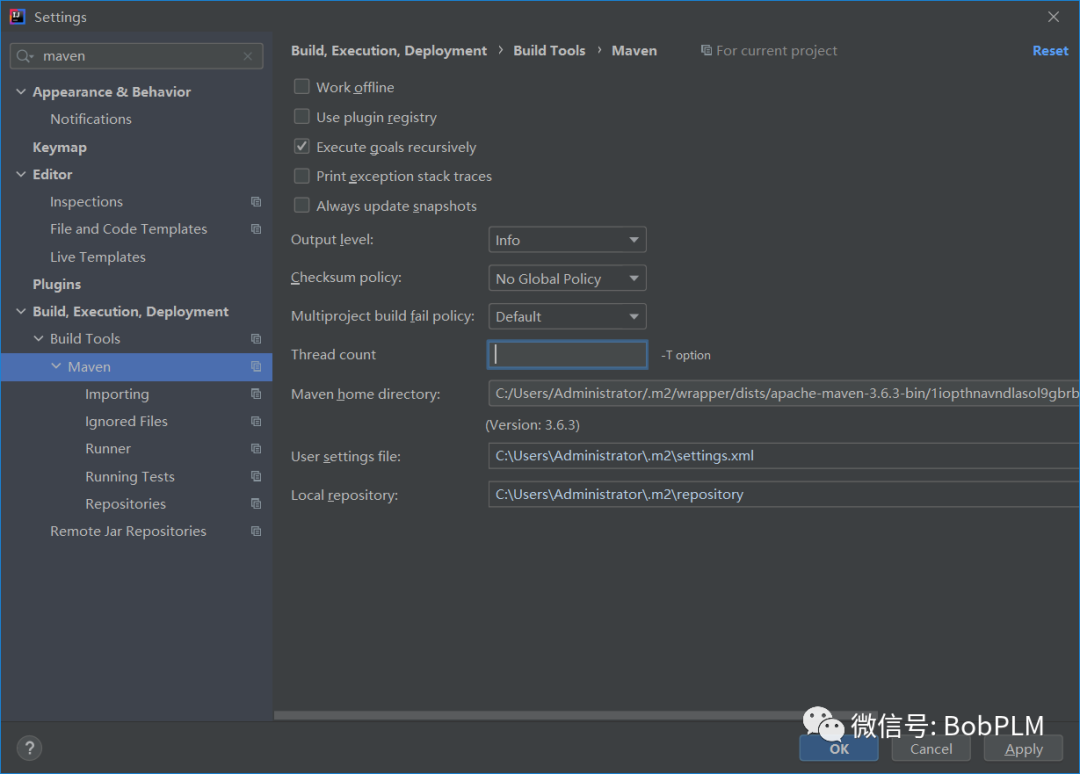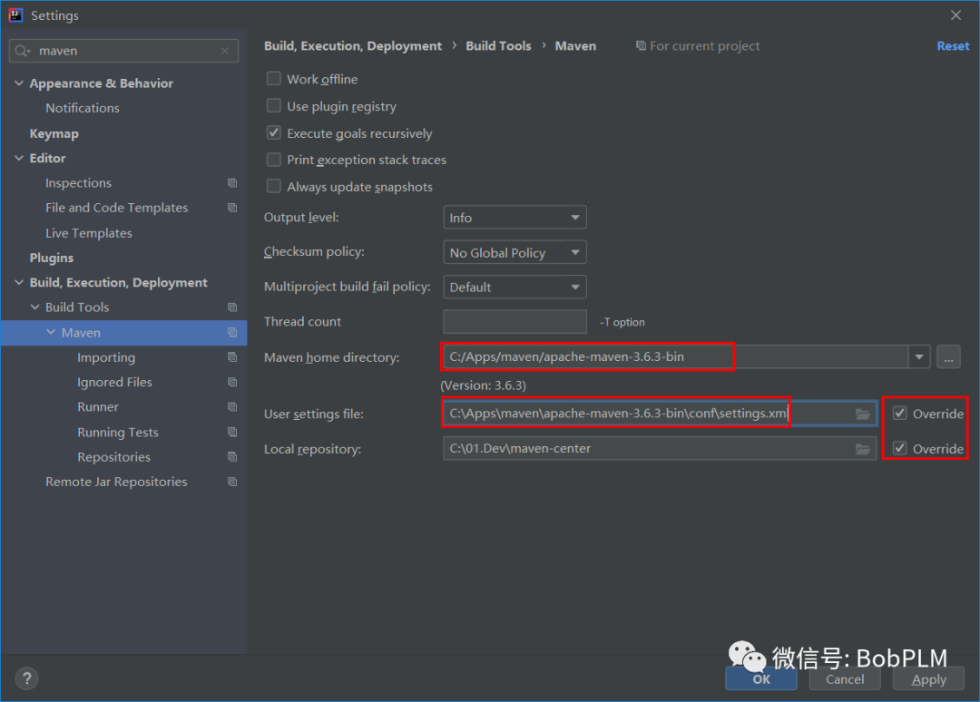 修改为我们配置的maven地址,在Maven home directory输入maven地址后Local repository会自动识别,配置User settings file为仓库的settings.xml地址,并勾选对应的Override(当然,这里也可以使用idea自己默认安装的maven,但需要修改默认对应的settings.xml里的仓库地址)