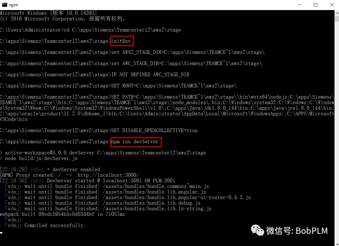 devServer启动首先会编译代码,并监控stage目录里代码变化,只要发现有变化就更新(这种方式省了手工刷新编译的时间,提高开发效率,类似于以前AWC4.2版本之前的express命令效果),脚本启动成功标记是: