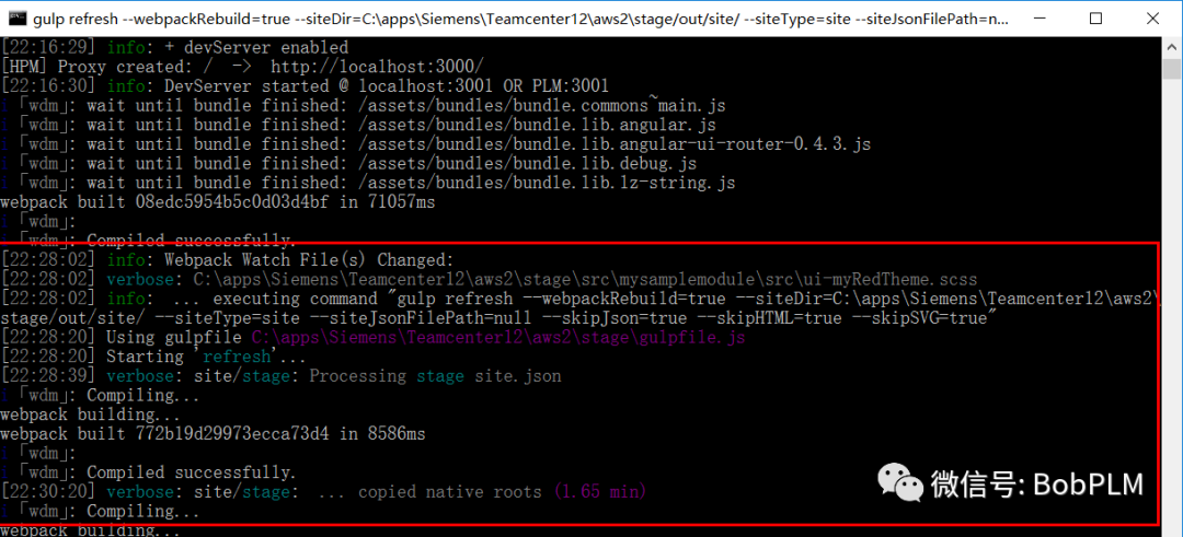[22:28:02] info: Webpack Watch File(s) Changed:[22:28:02] verbose: C:\apps\Siemens\Teamcenter12\aws2\stage\src\mysamplemodule\src\ui-myRedTheme.scss[22:28:02] info: ... executing command "gulp refresh --webpackRebuild=true --siteDir=C:\apps\Siemens\Teamcenter12\aws2\stage/out/site/ --siteType=site --siteJsonFilePath=null --skipJson=true --skipHTML=true --skipSVG=true"[22:28:20] Using gulpfile C:\apps\Siemens\Teamcenter12\aws2\stage\gulpfile.js[22:28:20] Starting 'refresh'...[22:28:39] verbose: site/stage: Processing stage site.jsoni 「wdm」: Compiling...webpack building...webpack built 772b19d29973ecca73d4 in 8586msi 「wdm」:i 「wdm」: Compiled successfully.