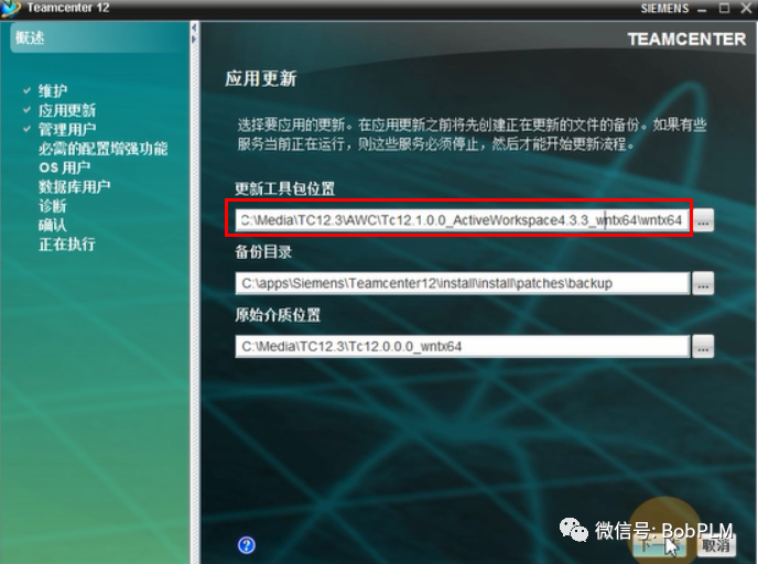 “更新工具包位置”中输入AW4.3.3的介质路径,点击“下一步”